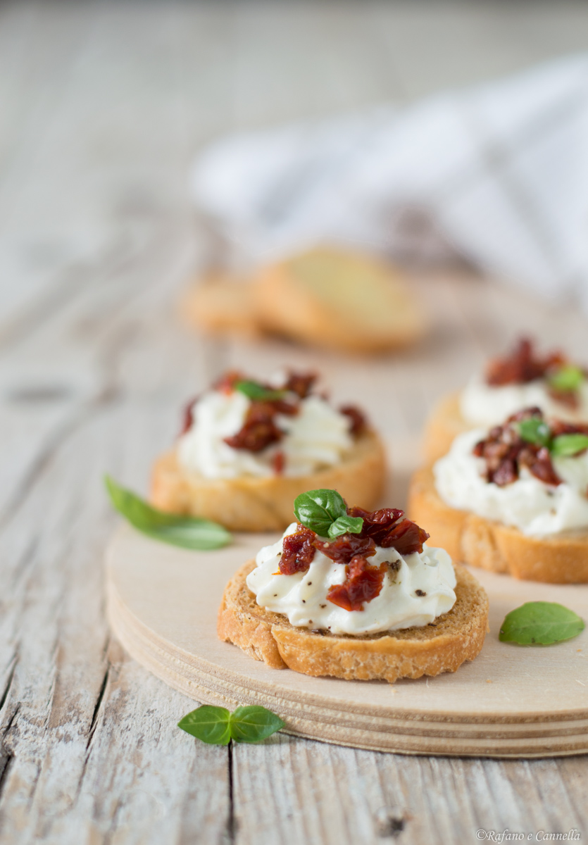 Tagliare finemente i Pomodori secchi sott’olio F.lli Amoretti di Lorenzo precedentemente sgocciolati dal loro olio e distribuirli sulla crema. Infine decorare ogni crostino con una fogliolina di basilico o un pochino di Pesto genovese F.lli Amoretti di Lorenzo.