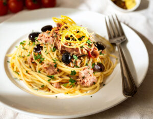 Spaghetti al limone con Tonno e Olive Taggiasche